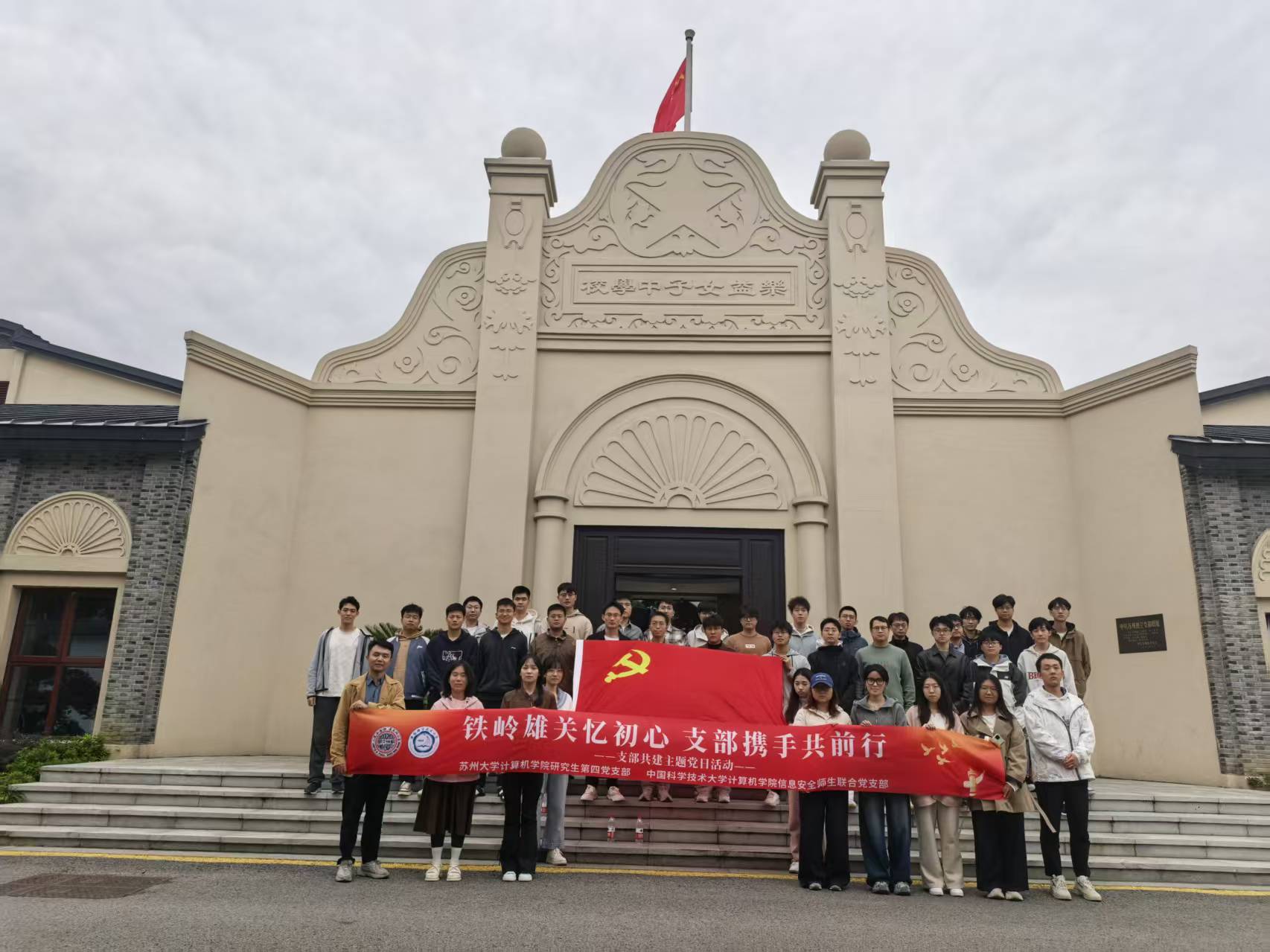 夕阳西下,两校党员面向党旗合影留念。镜头定格的瞬间,苏州独立支部旧址的雪松与新落成的铁岭关城门遥相辉映,恰似历史与未来的深情对话——先烈以热血浇灌理想,吾辈以科技续写华章。