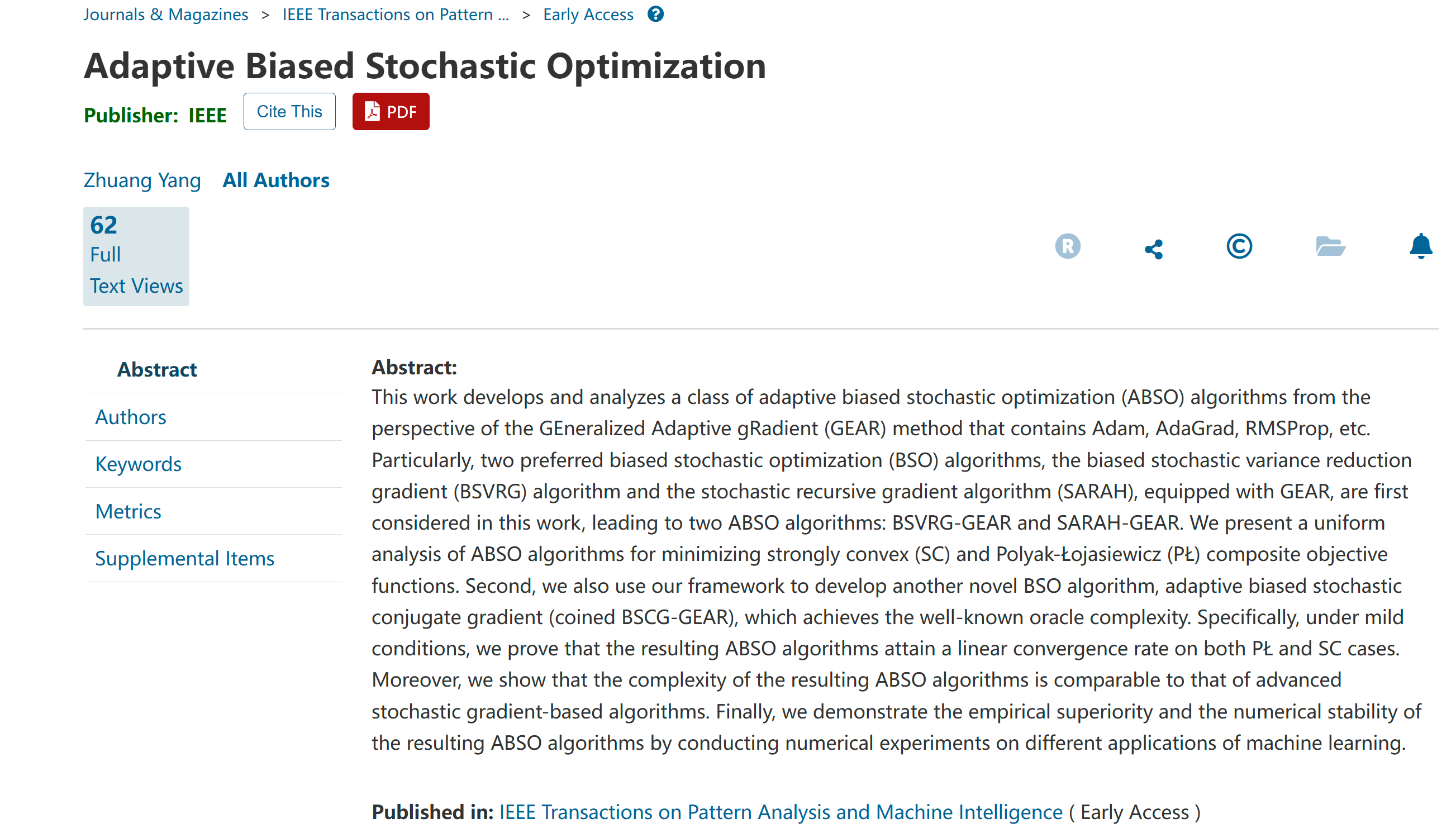 betway西汉姆联杨壮副教授在随机优化方面取得重要进展。相关成果以“Adaptive Biased Stochastic Optimization”为题被人工智能顶级学术期刊IEEE Transactions on Pattern Analysis and Machine Intelligence(IEEE TPAMI)接收,杨壮副教授为该论文的唯一作者,bw必威西汉姆联betway西汉姆联为该论文的唯一署名单位。