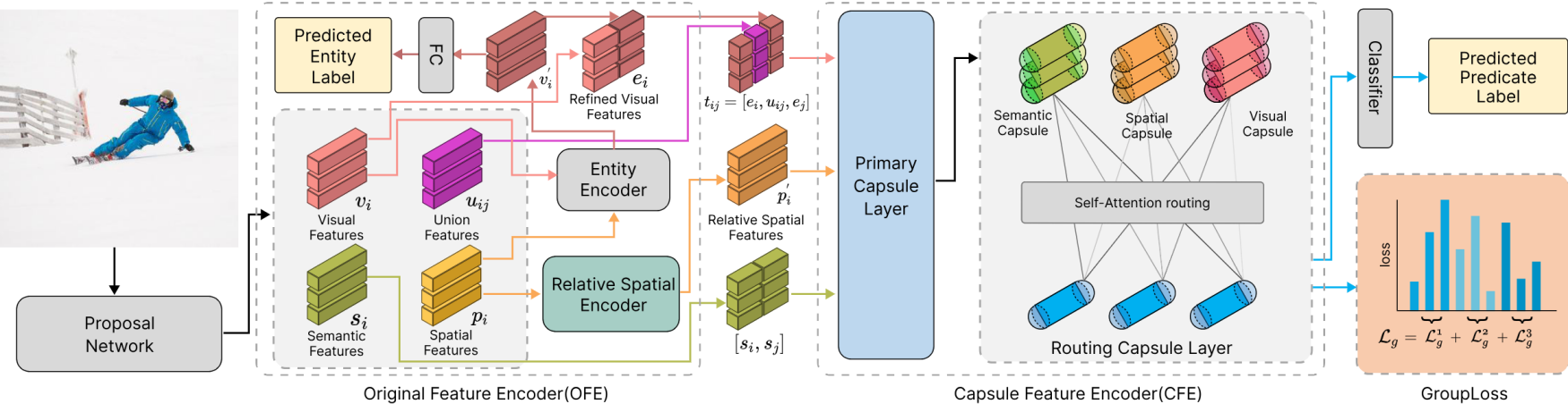 论文针对零样本场景图生成(Zero-shot SGG)任务中未见谓词预测的难题,创新性地提出基于胶囊网络的等变特征框架CAPSGG。该框架通过三流管道(Three-Stream Pipeline)与GroupLoss损失函数,有效提升模型对未知谓词的组合泛化能力,在多项标准指标中实现显著性能提升,为零样本场景理解提供了全新解决方案。